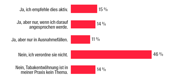 Uns hat interessiert, ob Sie von dieser neuen Möglichkeit Gebrauch machen und Raucherinnen und Rauchern bereits entsprechende Arzneimittel verordnet haben. Eine Umfrage des DeutschenArztPortals1 (n = 111) hat ergeben, dass die neue Möglichkeit noch selten genutzt wird. Lediglich 15 % empfehlen diese aktiv.